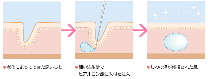 従来はしわの凸凹にコラーゲン注射が行われてきましたが、現在はアレルギーがほとんどなく、より持続期間の長いヒアルロン酸注射が主流となりました。